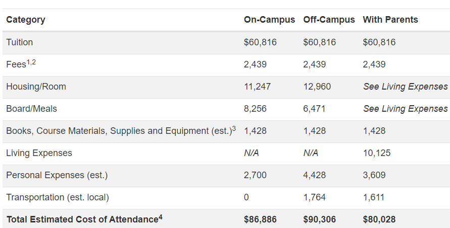 2023-2024学年,本科学生一年学费约为6万美金,住校加杂费一年约2万6千美金,总共约8万6千多美金。