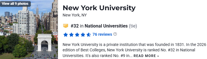 在2026 US News 美国大学排名中,NYU大学排名第32位。