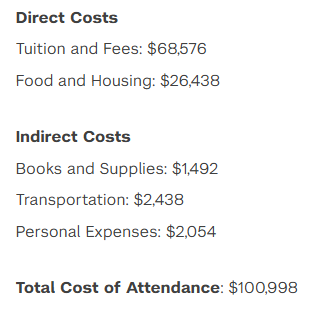 2025-2026学年,本科生一年学费约为6万8千多美金,加上住宿饮食等杂费一年总共约为10万美金。