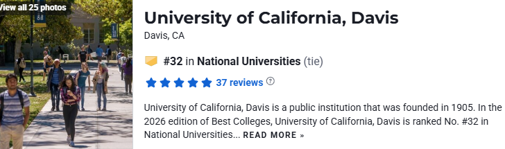 在2026年USNews 美国大学排名中,UCD位于第32名。