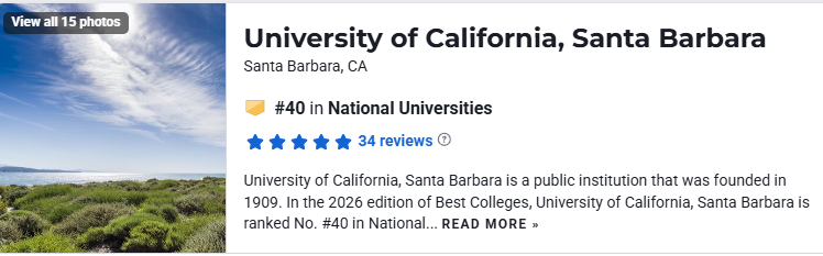 在2026 US News 美国大学排名中,UCSB大学位于第40位。