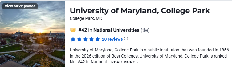 马里兰大学帕克分校(University of Maryland, College Park,简称 UMD或UMCP),是一所位于美国东部的大型公立综合性全国大学,成立于1856年。