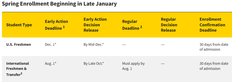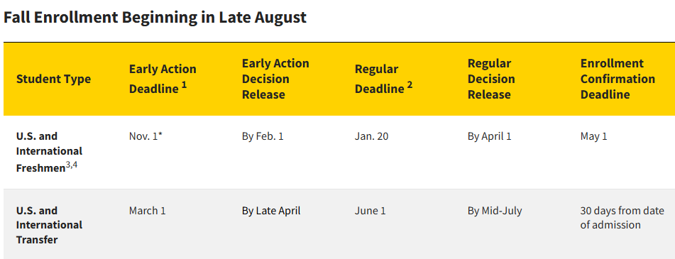 秋季Early action截止时间为3月1日,普通申请的截止时间为6月1日