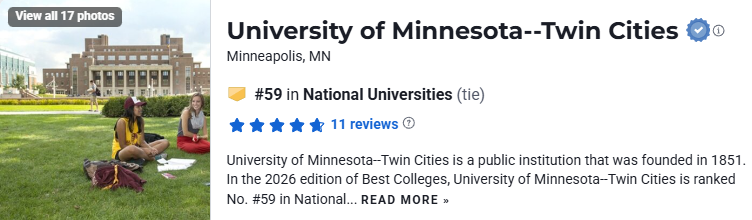 在2026年U.S. News美国大学排名中,UMN排在第59。