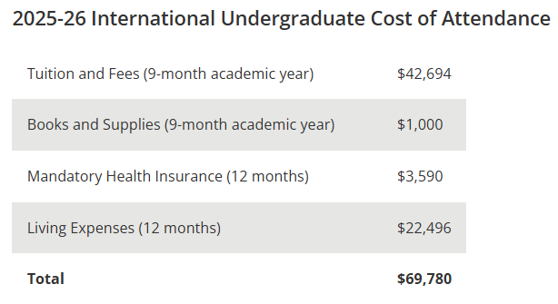 2025-2026学年, 国际生一年学费约为4万2千多美金,加上住宿饮食等杂费一年总共约为6万9千多美金。